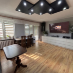 Wnętrze jest dobrze doświetlone, ustawne i gotowe do zamieszkania. Na podłogach panele,